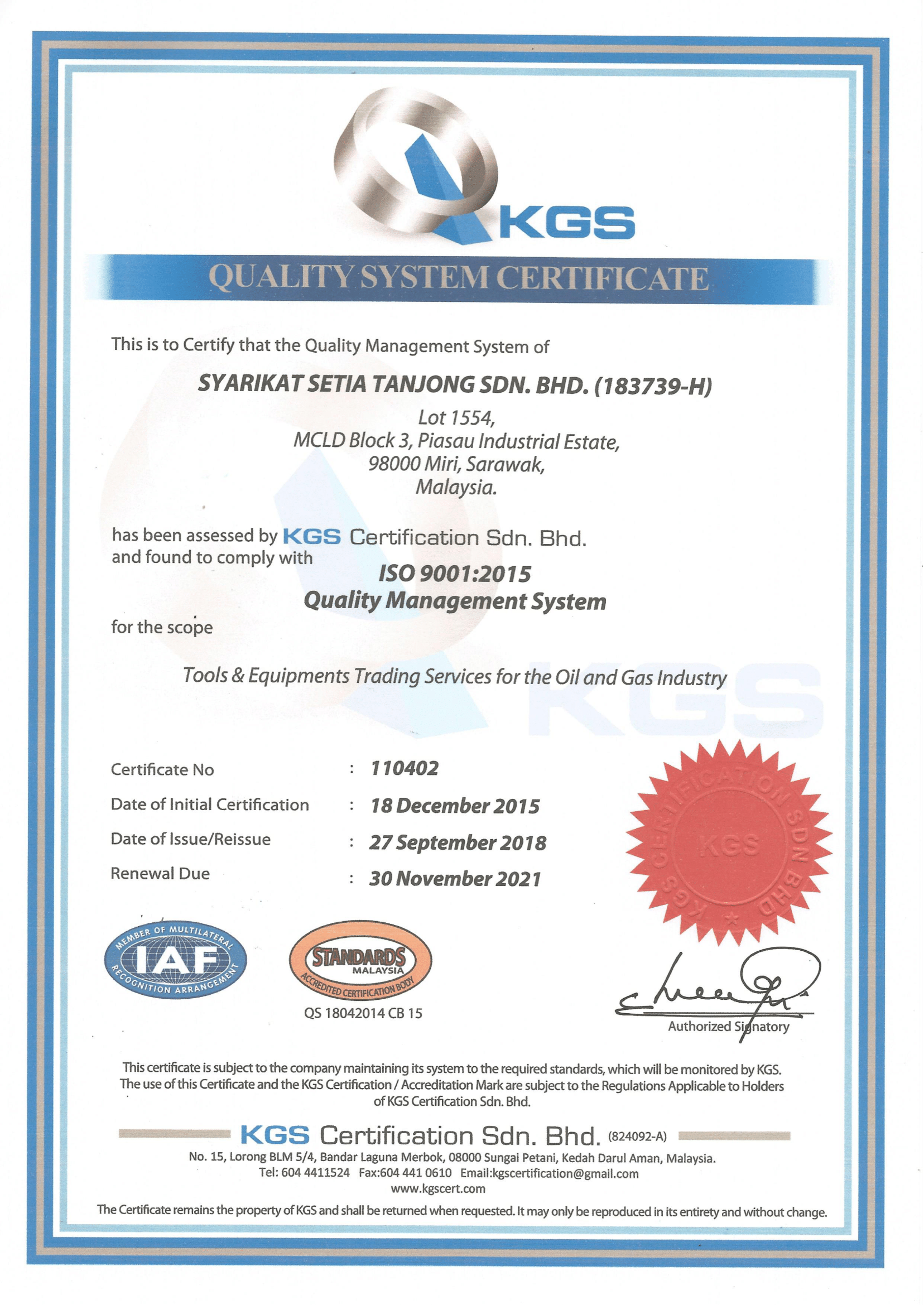 KGS Certification No.: 110402